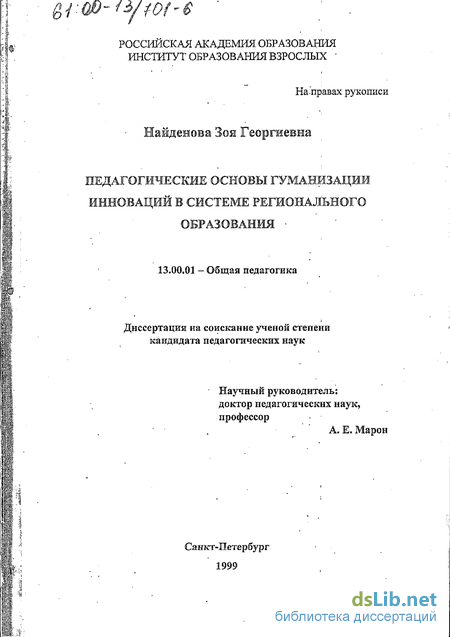 На основе анализа проблемы научно-педагогического обоснования гуманизации инновационных процессов в современных условиях развития системы регионального образования определена тема нашего диссертационного исследования "Педагогические основы гуманизации инноваций в региональной системе образования".