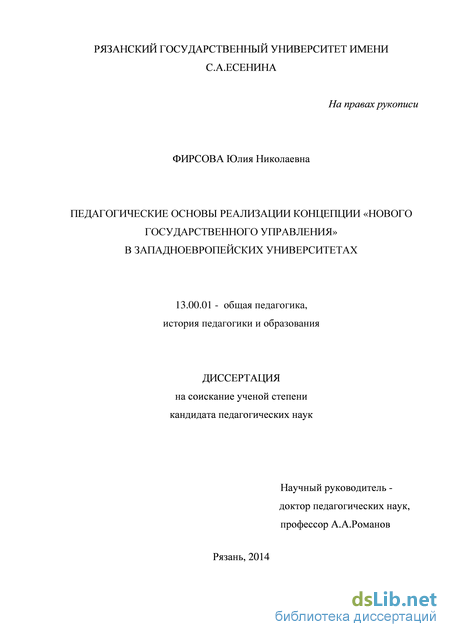 В настоящее время наблюдается повышение интереса к теме реформирования системы университетского образования европейских стран, что привело к появлению за последние несколько лет ряда диссертационных исследований. Однако они либо посвящены осмыслению происходящих изменений в рамках создания единого образовательного пространства на территории европейских государств (А.К. Ерохин, Т.С. Кашлачева, Л.А. Лазарева, Е.А. Мишина, Е.Е. Сухова), либо затрагивают проблемы государственного управления с политической точки зрения (С.А. Беляков, Т.В. Гуськова, Х.А. Халилова, Е.А. Шварцкопф). В тоже время в отечественной педагогике нет работ, анализирующих педагогические основы концепции «нового государственного управления». Таким образом, можно констатировать наличие ряда противоречий между: