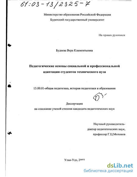 Все вышесказанное и обусловило выбор темы исследования: «Педагогические основы социальной и профессиональной адаптации студентов технического вуза».