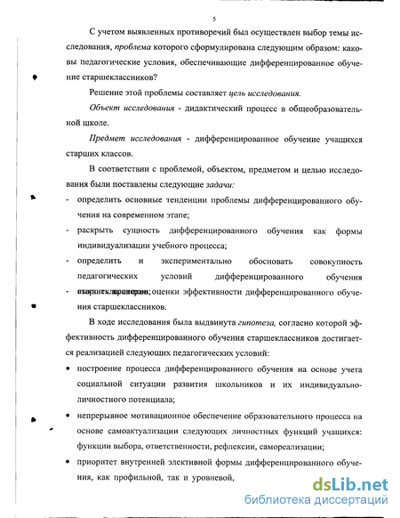 С учетом выявленных противоречий был осуществлен выбор темы исследования, проблема которого сформулирована следующим образом: каковы педагогические условия, обеспечивающие дифференцированное обучение старшеклассников?