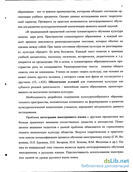 Проблема интеграции иностранного языка с другими предметами все больше привлекает внимание отечественных дидактов и методистов. Повышенное внимание педагогов к данной проблеме объясняется их стремлением поднять иноязычную культуру общества. Ведутся теоретические и практические поиски интенсификации процесса обучения иностранному языку (Г.И. Воронина, О.П. Еремина, Л.П. Загорная, И.Н. Зотеева, В.М. Филатова и др.). Одним из направлений этих поисков является задача интегрированного обучения иностранному и русскому языкам. Перспективность использования иностранных языков на уроках русского языка освещается в работах И. Фигуровского, Н.М. Шанского. Однако проблема параллельного изучения иностранных и русского языков, имеющего одной из целей (наряду с общелигвистической) формирование культурологической компетенции (в условиях интегрированного обучения - поликультурной компетенции) учащихся в процессе сопоставления двух культур, до настоящего времени не ставилась.