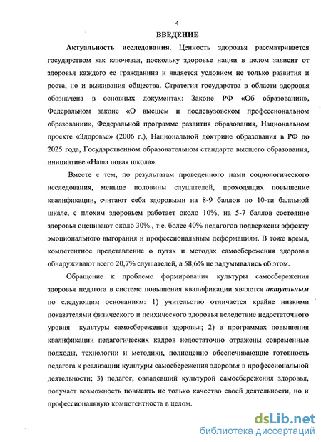 Актуальность исследования. Ценность здоровья рассматривается государством как ключевая, поскольку здоровье нации в целом зависит от здоровья каждого ее гражданина и является условием не только развития и роста, но и выживания общества. Стратегия государства в области здоровья обозначена в основных документах: Законе РФ «Об образовании», Федеральном законе «О высшем и послевузовском профессиональном образовании», Федеральной программе развития образования, Национальном проекте «Здоровье» (2006 г.), Национальной доктрине образования в РФ до 2025 года, Государственном образовательном стандарте высшего образования, инициативе «Наша новая школа» и т.д.