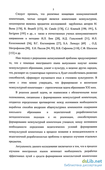 Следует признать, что различные концепции коммуникативной компетенции, частью которой является компетенция межкультурная, неоднократно являлись предметом исследований зарубежных авторов М. Berns [170], R. Brumfil [173], М. Canale [178], C.J. Kramsch [190, 191], S. Savignon [195] и др., а также и отечественных ученых коммуникативного направления в методике И.Л. Бим [20], Н.Д. Гальсковой [31], И.Л. Колесниковой [56], В.Г. Костомарова [27], Б.А. Лапидус [69] , О.Д. Митрофанова [90], Е.И. Пассов [94, 95], В.В. Сафонова [НО], С.Ф. Шатилов [153] и др.