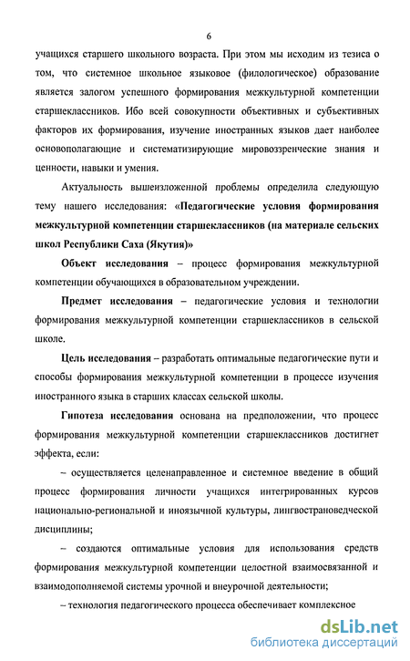 Предмет исследования - педагогические условия и технологии формирования межкультурной компетенции старшеклассников в сельской школе.