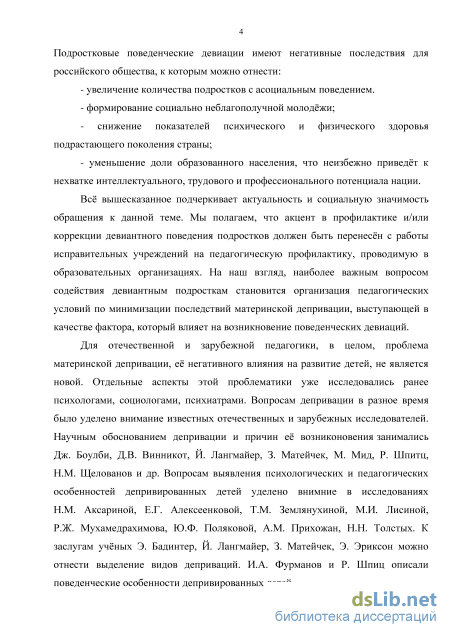 Однако, несмотря на непреходящий интерес ученых к проблемам деприваций и девиантного поведения, девиантное поведение подростков, возникающее вследствие пребывания детей в условиях материнской депривации, требует дальнейшего изучения.