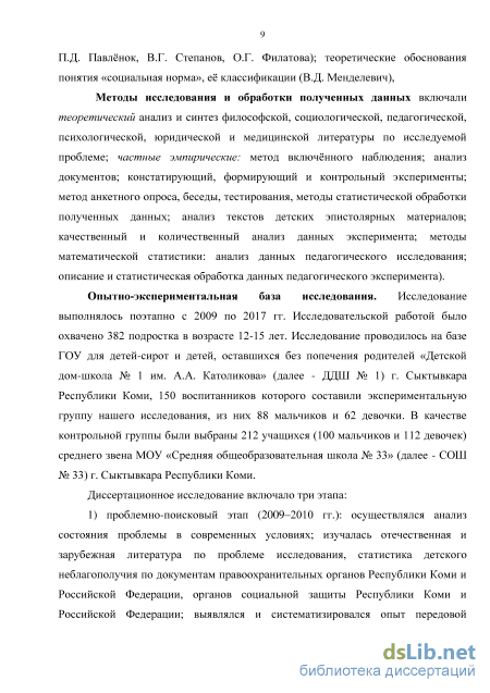 «Сегодня изучение девиантного поведения является междисциплинарной проблемой, решаемой в рамках девиантологии, включающей в себя знания таких наук, как клиническая и возрастная психологии, семейная психотерапия, патопсихология, нейропсихология, психология личности, психиатрия, педагогика, социология, философия» [105].