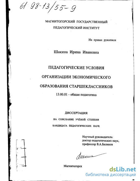 Названная проблема определила выбор темы исследования: "Педагогические условия организации экономического образования старшеклассников".