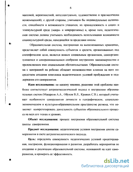 Предмет исследования: педагогические условия построения школы саморазвития в свете антропоэкологического подхода.