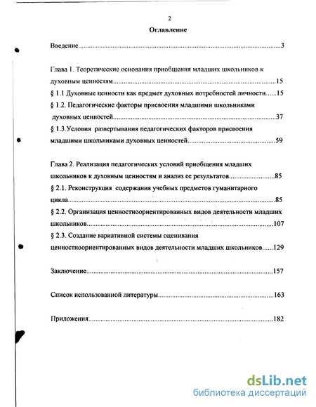 В первой главе «Теоретические основания приобщения младших школьников к духовным ценностям» исследуется содержание и педагогическое значение категории «духовные ценности», выявляются внутренние предпосылки и педагогические факторы присвоения младшими школьниками духовных ценностей, обосновывается совокупность педагогических условий развертывания данных факторов, критерии отслеживания приобщенности младших школьников к духовным ценностям.