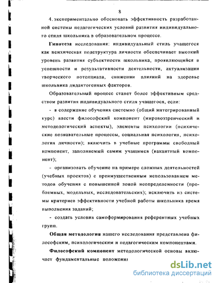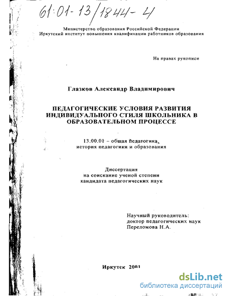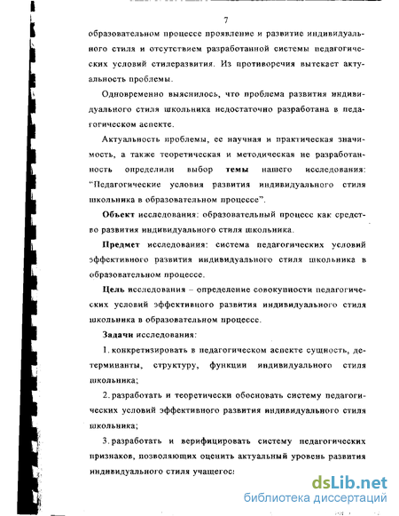 Объект исследования: образовательный процесс как средство развития индивидуального стиля школьника-Предмет исследования: система педагогических условий эффективного развития индивидуального стиля школьника в образовательном процессе.