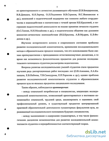 - между социальной потребностью в специалистах, владеющих исследовательской компетентностью, позволяющей ориентироваться в постоянно изменяющейся социальной, трудовой среде, анализировать и оценивать свой профессиональный уровень, и существующей предметно центрированной практикой образовательной деятельности гуманитарных факультетов вуза, не развивающей исследовательского потенциала будущих специалистов;