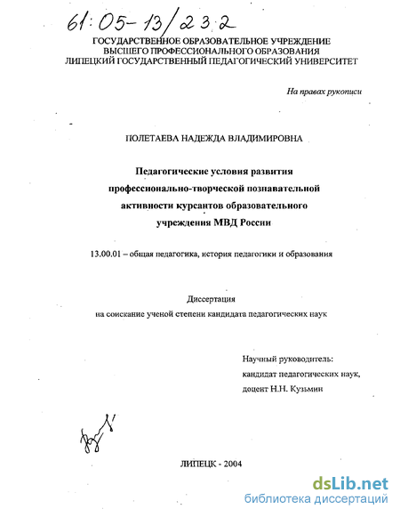 В свою очередь, это противоречие обусловило несоответствие: между возросшей потребностью органов внутренних дел России в активно развивающемся и реализующем себя в профессиональной деятельности офицере и неразработанностью психолого-педагогических условий дальнейшего развития профессионально-творческой познавательной деятельности курсанта в образовательном процессе;