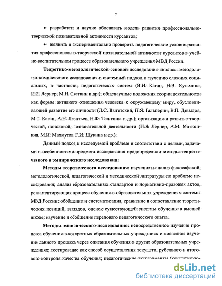 Методы теоретического исследования: изучение и анализ философской, методологической, педагогической и методической литературы по проблеме исследования; анализ образовательных стандартов и нормативно-правовых актов, регламентирующих процесс обучения в образовательных учреждениях системы МВД России; обобщение и систематизация, сравнение и сопоставление теоретических позиций, взглядов, оценок существующей системы обучения в высшей школе; изучение и обобщение передового педагогического опыта.