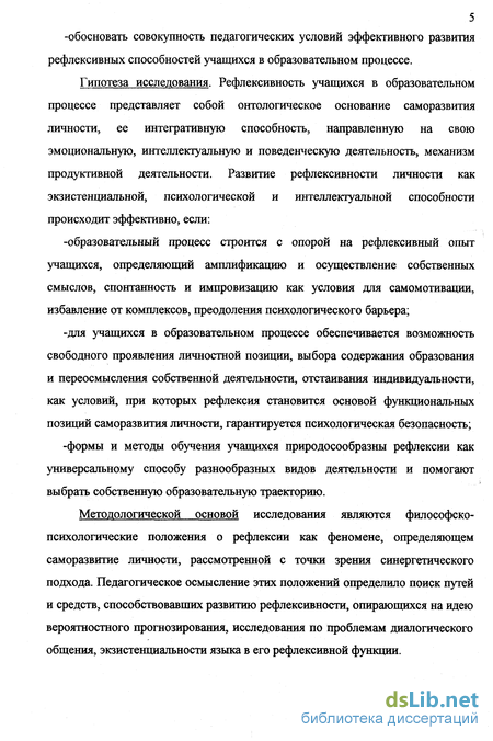 Гипотеза исследования. Рефлексивность учащихся в образовательном процессе представляет собой онтологическое основание саморазвития личности, ее интегративную способность, направленную на свою эмоциональную, интеллектуальную и поведенческую деятельность, механизм продуктивной деятельности. Развитие рефлексивности личности как экзистенциальной, психологической и интеллектуальной способности происходит эффективно, если: