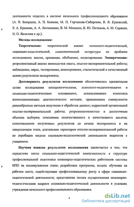 Методологическую основу исследования составили важнейшие положения философии о деятельности и развитии личности, взаимосвязи общества и образования, системного и личностно ориентированного подходов к изучению социально-педагогических явлений в их практическом единстве (Е. В. Бондаревская, В. В. Краевский, Е. А. Крюкова, В. М. Монахов, А. М. Саранов, В. В. Сериков, Н. К. Сергеев и др.). Социально-философскую основу исследования составляют теоретические положения современных авторов по вопросам повышения квалификации на разных этапах деятельности педагога как объективной потребности личности и времени (Ю. К. Бабанский, Е. П, Белозерцев, Б. С. Гершунский, А. М. Новиков, И. П. Смирнов и др.). Определяя психолого-педагогические подходы к формированию социально-педагогической компетентности инженерно-педагогических кадров системы начального профессионального образования, мы опирались на труды по теории социально-педагогической деятельности (В. Г. Бочарова, Н. Ф. Басова, Б. 3. Вульфов, М. А. Галагузова, В. П. Кащенко, А. В. Мудрик, Е. Н. Степанов, Н. Е. Щуркова, Г. Н. Филонов и др.), на методологическое обоснование процедур проектирования модели осуществления социально-педагогической