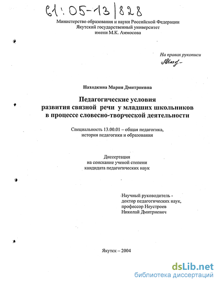Предмет исследования - педагогические условия развития связной речи у младших школьников-якутов в процессе словесно-творческой деятельности.