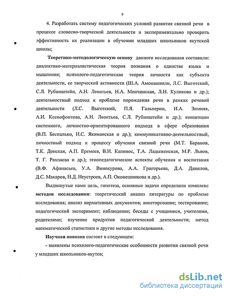 Теоретико-методологическую основу данного исследования составили: диалектико-материалистическая теория познания о единстве языка и мышления; психолого-педагогическая теория личности как субъекта деятельности, ее творческой активности (Ш.А. Амонашвили, Л.С. Выготский, С.Л. Рубинштейн, А.Н. Леонтьев, Н.А. Менчинская, Л.Н. Куликова и др.); деятельностный подход к проблеме порождения речи в рамках речевой деятельности (Л.С. Выготский, П.Я. Гальперин, И.А. Зимняя, А.И. Ксенофонтова, А.Н. Леонтьев, С.Л. Рубинштейн и др.); концепции системного, личностно-ориентированного подхода в сфере образования (В.П. Беспалько, И.С. Якиманская и др.); коммуникативно-деятельностный, личностный подход к процессу обучения связной речи (М.Т. Баранов, Т.К. Донская, А.П. Еремеев, В.И. Капинос, Т.А. Ладыженская, М.Р. Львов, Т. Г. Рамзаева и др.); этнопедагогические аспекты обучения и воспитания (В.Ф. Афанасьев, У.А. Винокурова, А.А. Григорьева, Д.А. Данилов, Д.С. Макаров, Н.Д. Неустроев, А.П. Оконешникова и др.).