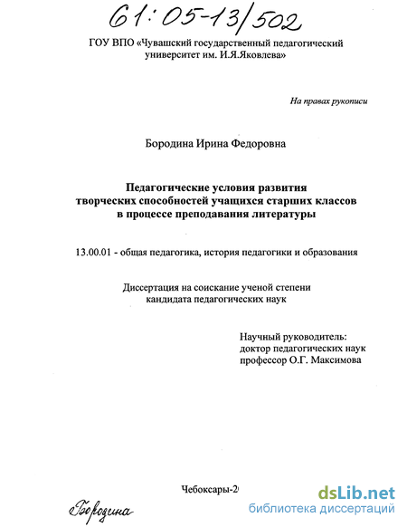13 включение родителей и учителей-предметников в процесс развития творческих способностей учащихся данного школьного возраста; разработка и внедрение научно обоснованной системы развития творческих способностей у учащихся старших классов в процессе преподавания литературы, предполагающей и широкое создание в школе творческо-поисковой среды.