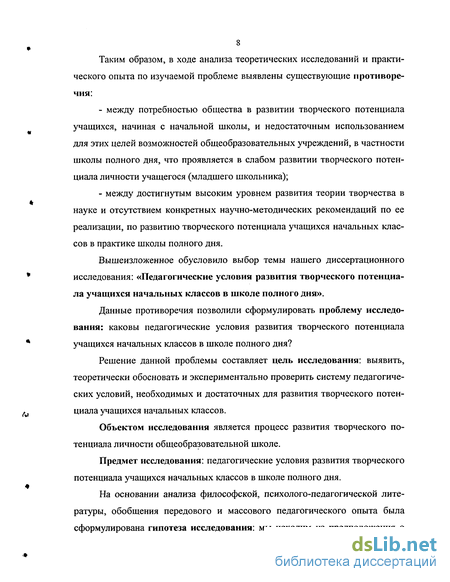 Данные противоречия позволили сформулировать проблему исследования: каковы педагогические условия развития творческого потенциала учащихся начальных классов в школе полного дня?