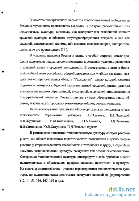 В качестве интегративного параметра профессиональной мобильности будущих тружеников производства академик П.Р.Атутов рассматривает технологическую культуру, поскольку она выступает как важнейший элемент трудовой культуры и обладает структурообразующим статусом в ней как сложной, динамической системы, ибо главным является вопрос, как производится, а не что производится (14 ).