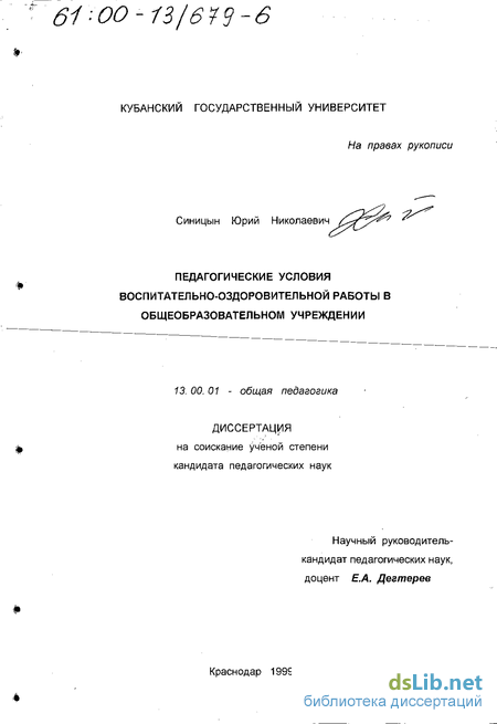 Все это обусловило выбор темы исследования "Педагогические условия воспитательно-оздоровительной работы в общеобразовательном учреждении".