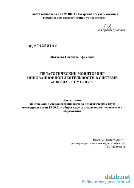 Цель диссертационного исследования: теоретико-методологическое обоснование педагогического мониторинга инновационной деятельности в системе «Школа - ссуз - вуз».