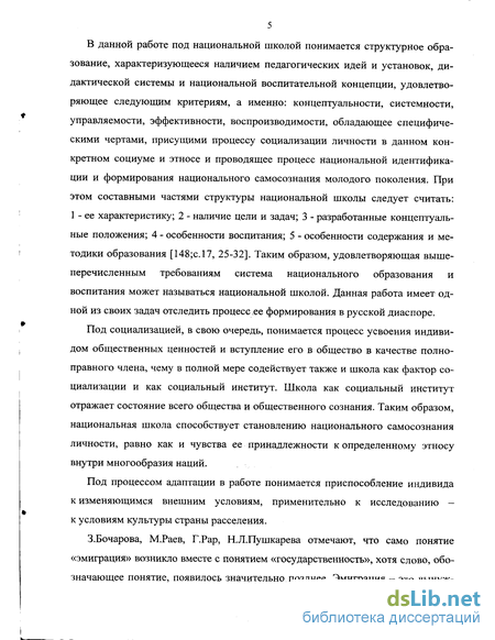 5 В данной работе под национальной школой понимается структурное образование, характеризующееся наличием педагогических идей и установок, дидактической системы и национальной воспитательной концепции, удовлетворяющее следующим критериям, а именно: концептуальности, системности, управляемости, эффективности, воспроизводимости, обладающее специфическими чертами, присущими процессу социализации личности в данном конкретном социуме и этносе и проводящее процесс национальной идентификации и формирования национального самосознания молодого поколения. При этом составными частями структуры национальной школы следует считать: 1 - ее характеристику; 2 - наличие цели и задач; 3 - разработанные концептуальные положения; 4 - особенности воспитания; 5 - особенности содержания и методики образования [148;с.17, 25-32]. Таким образом, удовлетворяющая вышеперечисленным требованиям система национального образования и воспитания может называться национальной школой. Данная работа имеет одной из своих задач отследить процесс ,ее формирования в русской диаспоре.
