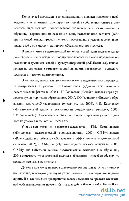Диалог является средством реализации основных положений личност-но-ориентированного обучения (И.С. Якиманская, В.В. Сериков и др.). Диа-логика мышления, диалогические аспекты учебной деятельности, диалог как фактор и условие развития личности представлены в исследованиях по педагогической психологии (А.А.Бодалев, М.В.Гулакова, Е.Г.Злобина, М.С.Каган, И.С.Кон, Т.С.Кудрина, А.В.Мудрик, В.И.Мясищев, В.В.Немирова, О.К.Сазонова, Н.Б.Шмакова, Е.С.Шевченко, Н.Ш.Щерба).