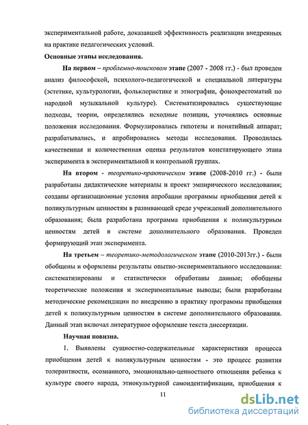 В процессе исследования определены теоретико-методологические и программно-методические основы процесса приобщения детей к поликультурным ценностям в системе дополнительного образования и его педагогического обеспечения. Выявлены сущностно-содержательные характеристики процесса приобщения детей к поликультурным ценностям. Это процесс развития толерантности, осознанного, эмоционально ценностного отношения ребенка к культуре своего народа, этнокультурной самоидентификации, приобщения к культуре других народов России, мира, становления личности ребенка как носителя «мировой культуры».