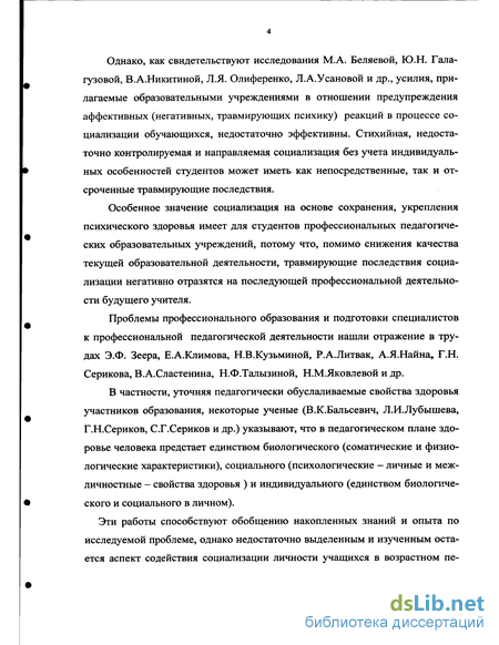 Эти работы способствуют обобщению накопленных знаний и опыта по исследуемой проблеме, однако недостаточно выделенным и изученным остается аспект содействия социализации личности учащихся в возрастном пе риоде получения среднего профессионального педагогического образования на основе сохранения их психического здоровья.