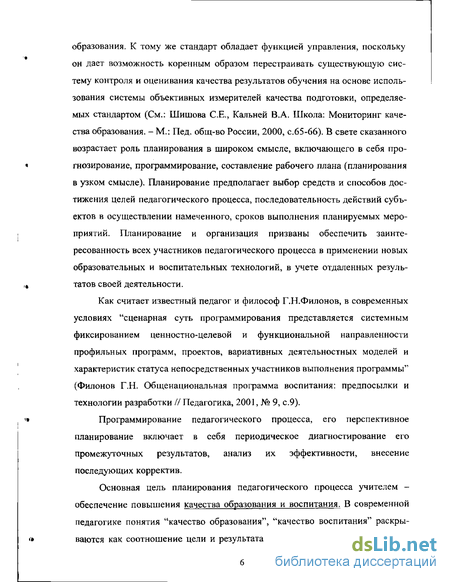 образования. К тому же стандарт обладает функцией управления, поскольку он дает возможность коренным образом перестраивать существующую систему контроля и оценивания качества результатов обучения на основе использования системы объективных измерителей качества подготовки, определяемых стандартом (См.: Шишова С.Е., Кальней В.А. Школа: Мониторинг качества образования. - М.: Пед. общ-во России, 2000, с.65-66). В свете сказанного возрастает роль планирования в широком смысле, включающего в себя прогнозирование, программирование, составление рабочего ллана (планирования в узком смысле). Планирование предполагает выбор средств и способов достижения целей педагогического процесса, последовательность действий субъектов в осуществлении намеченного, сроков выполнения планируемых мероприятий. Планирование и организация призваны обеспечить заинтересованность всех участников педагогического процесса в применении новых образовательных и воспитательных технологий, в учете отдаленных результатов своей деятельности.