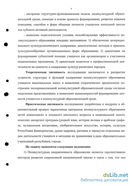 На защиту выносятся следующие положения: 1). Поликультурная направленность образования является перспективным вектором развития современной национальной школы в связи с тем, что она наиболее соответствует социальному заказу со стороны многокультурного гетерогенного общества;
