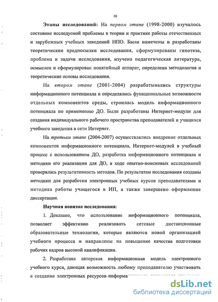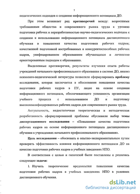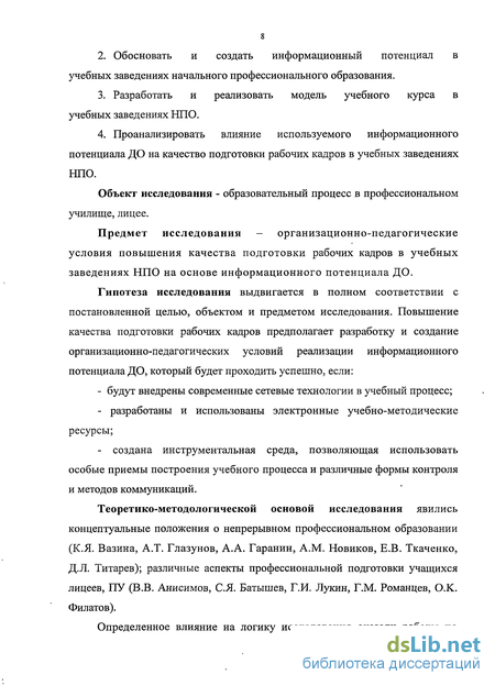Предмет исследования — организационно-педагогические условия повышения качества подготовки рабочих кадров в учебных заведениях НПО на основе информационного потенциала ДО.