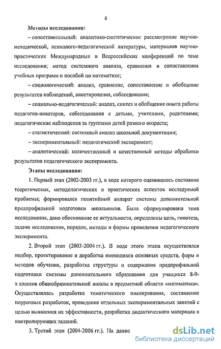 Первый этап (2002-2003 гг.), в ходе которого оценивалось состояния теоретических, методологических и практических аспектов исследуемой проблемы; формировался понятийный аппарат системы дополнительной предпрофильной подготовки школьников. Была сформулирована тема исследования, дано обоснование ее актуальности, определены цель, гипотеза, задачи исследования, порядок, методы и формы проведения педагогического эксперимента.