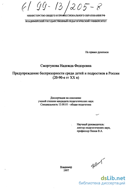 Научный аппарат исследования. Основные понятия, используемые в диссертации: беспризорность (детская) — отсутствие у детей и подростков постоянного места жительства, определенных занятий, семейного или государственного попечения и систематического воспитательного воздействия в результате утраты родителей, ухода из семьи, бегства из воспитательного учреждения и т.п. причин; безнадзорность (детская) — отрыв несовершеннолетнего в той или иной мере от непосредственной социальной среды, организующей его поведение в соответствии с требованиями общества, разрушение его социальных связей; девиантное поведение — отдельный поступок или система поступков личности, нарушаю-щие сложившиеся в данном обществе социально-психологические, нравственные или культурные нормы; социальная запущенность — состояние формирующейся личности ребенка, при котором нарушения и деформации процесса социализации обусловлены социально-педагогическими причинами и носят злокачественный характер.