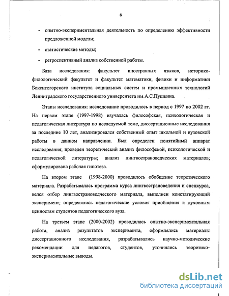 Этапы исследования: исследование проводилось в период с 1997 по 2002 гг. На первом этапе (1997-1998) изучалась философская, психологическая и педагогическая литература по исследуемой теме, диссертационные исследования за последние 10 лет, анализировался собственный опыт школьной и вузовской работы в данном направлении. Был определен понятийный аппарат исследования; проведен теоретический анализ философской, психологической и педагогической литературы; анализ лингвострановедческих материалов; сформулирована рабочая гипотеза.
