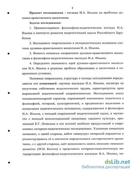 Основные направления, структура и методы исследования определяются его концепцией: научное наследие И.А. Ильина, несмотря на отсутствие собственно педагогических трудов, характеризуется ярко выраженной педагогической направленностью. Исследование носит междисциплинарный характер, отражающий взаимосвязь педагогики с философией, историей, культурологией, и предполагает выделение и осмысление педагогического потенциала, содержащегося в философии И.А. Ильина, с позиций современной педагогической науки, в частности с позиций цивилизационной концепции «диалога культур», признанной Е.Г. Осовским и его школой наиболее продуктивной в современных историко-педагогических исследованиях. Указанная концепция позволяет, с одной стороны, войти «вовнутрь» авторской парадигмы и реконструировать её в контексте определенного «исторического хронотопа», а с другой стороны, даёт возможность занять позицию «вненахо-димости» (М.М. Бахтин) и представить историко-педагогическую интерпретацию философско-педагогического наследия И.А. Ильина, оп-