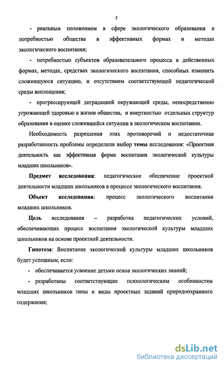 Необходимость разрешения этих противоречий и недостаточная разработанность проблемы определили выбор темы исследования: «Проектная деятельность как эффективная форма воспитания экологической культуры младших школьников».