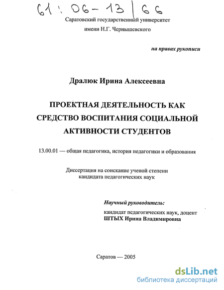 - Научно-теоретическое обоснование системы воспитания социальной активности студентов в условиях студенческого самоуправления на основе проектной деятельности