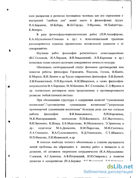 В исследовании использована совокупность научных идей, которая позволила осуществить концептуальный синтез теоретических положений, разкрывагощих изучаемую проблему: - основные положения системно-структурного и синергетического подходов, рассматриваемые применительно к педагогическим явлениям и процессам (Л.И.Анцыферова, В.И.Аршинов, А.В.Брушлинский, Е.Н.Князева, СП.Курдюмов, И.Пригожин, Я.И.Свирский); -утверждение о саморазвитии личности как сложной саморазвивающейся системы и об открытости этого процесса в философии (Г.С.Батищев, М.С.Каган, П.Ф.Каптерев, К.Ясперс и др.); -психологические подходы к саморазвитию личности как основе гуманизации образования (О.С.Газман, В.П.Зинченко, Л.Н.Куликова, А.Г.Цукерман и др.); -идеи личностно ориентированного и ценностно-личностного подходов к развитию личности (Е.В.Бондаревская, Т.Н.Мальковская, Л.И.Новикова, С.Д.Поляков, В.В.Сериков и др.); положения о педагогических условиях саморазвития личности ребёнка и педагога как главного условия гуманизации воспитания (О.С.Газман, Н.Г.Григорьева, Л.Н.Куликова и её ученики: Г, П.Звенигородская, Л.П.Лазарева, Е.В.Прозорова, Е.Л.Федотова, Е.В.Шишмакова и др.); экзистенциальные идеи о трансцендентной сущности человека, о его потенциальных возможностях творения добра, терпимости, отзывчивости; о гуманистических способах освоения действительности и др.( М.М.Бахтин, Л.П.Буева,Гавриловец К.В., В,П.Зинченко и др.); - представления о целостном подходе к личности и к педагогическому процессу ( В.Н.Сагатовский, В.С.Шубинский и др.), в котором преодоление противоречий гуманизации воспитания рассматривается как целостный инвариантный процесс, приводящий к гуманизации воспитания; - идеи свободного воспитания, духовного единения педагога и ребёнка в педагогике К.Н.Вентцеля, Л.Н.Толстого, В.А.Сухомлинского, В.Н.Сорока-Росинского; положения о духовных этапах "возрастания" личности Д.Пауэлса; идеи самоактуализации, личностного роста, поиска смысла жизни А.Адлера, А.Маслоу, В.Франкла, С.Л.Франка, Э.Фромма, Э.Эриксона; идеи самоорганизации как основа гуманизации образования, воспитания в исследованиях Л.Н.Куликовой и представителей её научной школы; глубокий анализ гуманистической традиции в зарубежной и отечественной педагогической мысли (Л.А.Степашко, А.Г.Кузнецова,М.Н.Невзоров, Н.П.Юдина и др.).