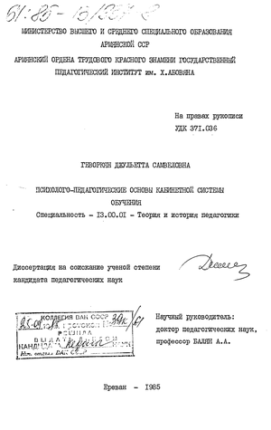 ческом уровне обосновывается и дается психолого-педагогический анализ опыта организации кабинетной системы обучения, определяются методические принципы и содержание работ кабинетов-лабораторий по всем предметам во всех классах.