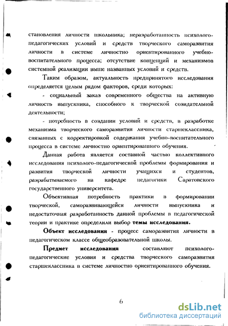 Предмет исследования составляют психолого педагогические условия и средства творческого саморазвития старшеклассника в системе личностно ориентированного обучения.