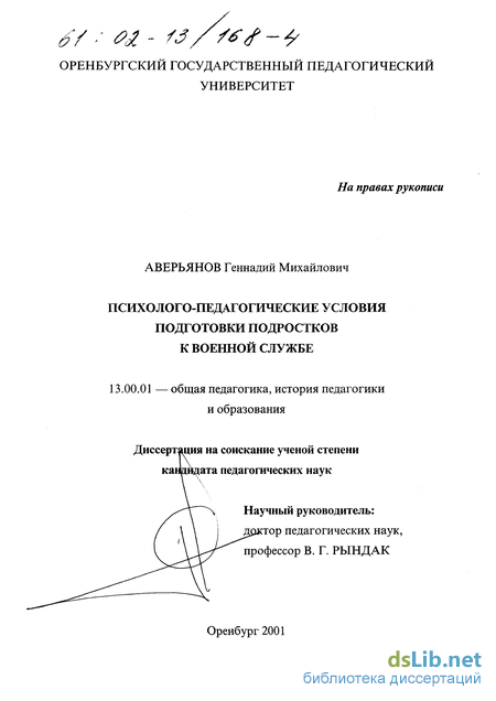 Актуальность, практическая значимость и недостаточная теоретическая разработанность проблемы подготовки подростков к военной службе в новых социально-политических условиях определили выбор темы исследования — «Психолого-педагогические условия подготовки подростков к военной службе».
