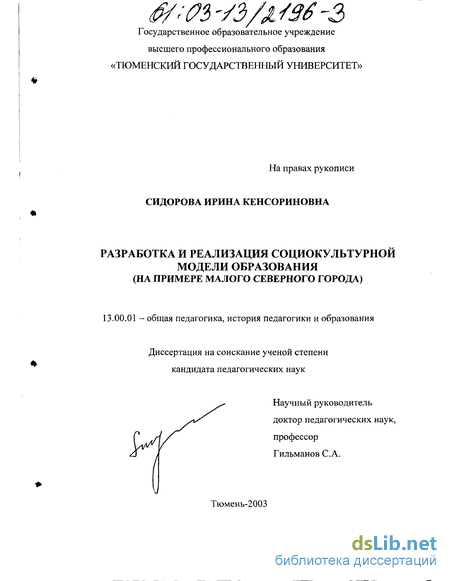Проблема исследования определяет и его тему: «Разработка и реализация социокультурной модели образования (на примере малого северного города)».