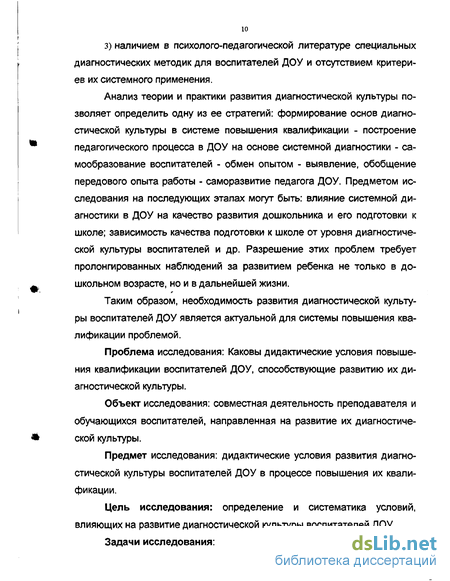 Практика показывает, что воспитатели затрудняются в применении современных методов поиска, обработки и использования информации, интерпретации и адаптации информации для адресата, что соответствует минимуму содержания и уровню подготовки выпускников по специальности 030900. В раздел педагогики среднего образования государственного стандарта входит только один раздел «Методы научного исследования» [65, с. 3]. Диссертант считает, что это является недостаточным для развития диагностической культуры воспитателей и оптимизации образовательного процесса в ДОУ.