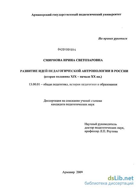 Объективная оценка русской педагогической антропологии предполагает историко-научную реконструкцию наследия ее представителей, выход на системный уровень анализа их концептуальных построений. Современный этап в развитии отечественной педагогической науки дает возможность увидеть в наследии русских педагогов-антропологов новые аспекты содержания их педагогических идей. Этому способствует существующий мировоззренческий и методологический плюрализм, стремление к объективному видению исторического развития педагогической проблематики.
