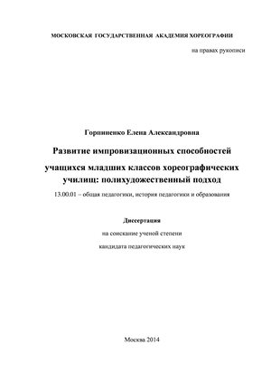 Названные особенности и противоречия определяют актуальность исследовательской проблемы и формулировку темы диссертации: «Развитие импровизационных способностей учащихся младших классов хореографических училищ: полихудожественный подход».