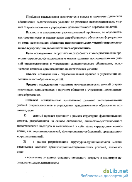 Проблема исследования заключается в поиске и научно-методическом обосновании педагогических условий по развитию исследовательских умений старшеклассников в учреждении дополнительного образования детей.