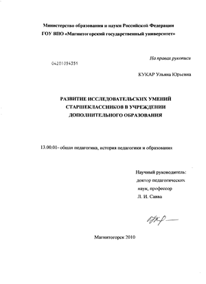 возможностью учреждений дополнительного образования детей эффективно развивать исследовательские умения старшеклассников и недостаточной научно-методической разработкой данного процесса в педагогической теории и практике.