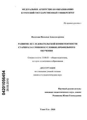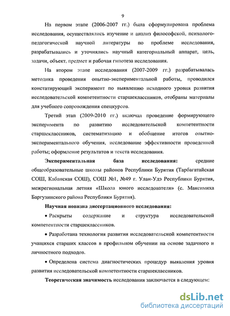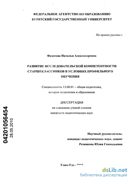 Актуальность, теоретическая и практическая значимость рассматриваемой проблемы послужили основанием определения темы диссертационного исследования: «Развитие исследовательской компетентности старшеклассников в условиях профильного обучения».